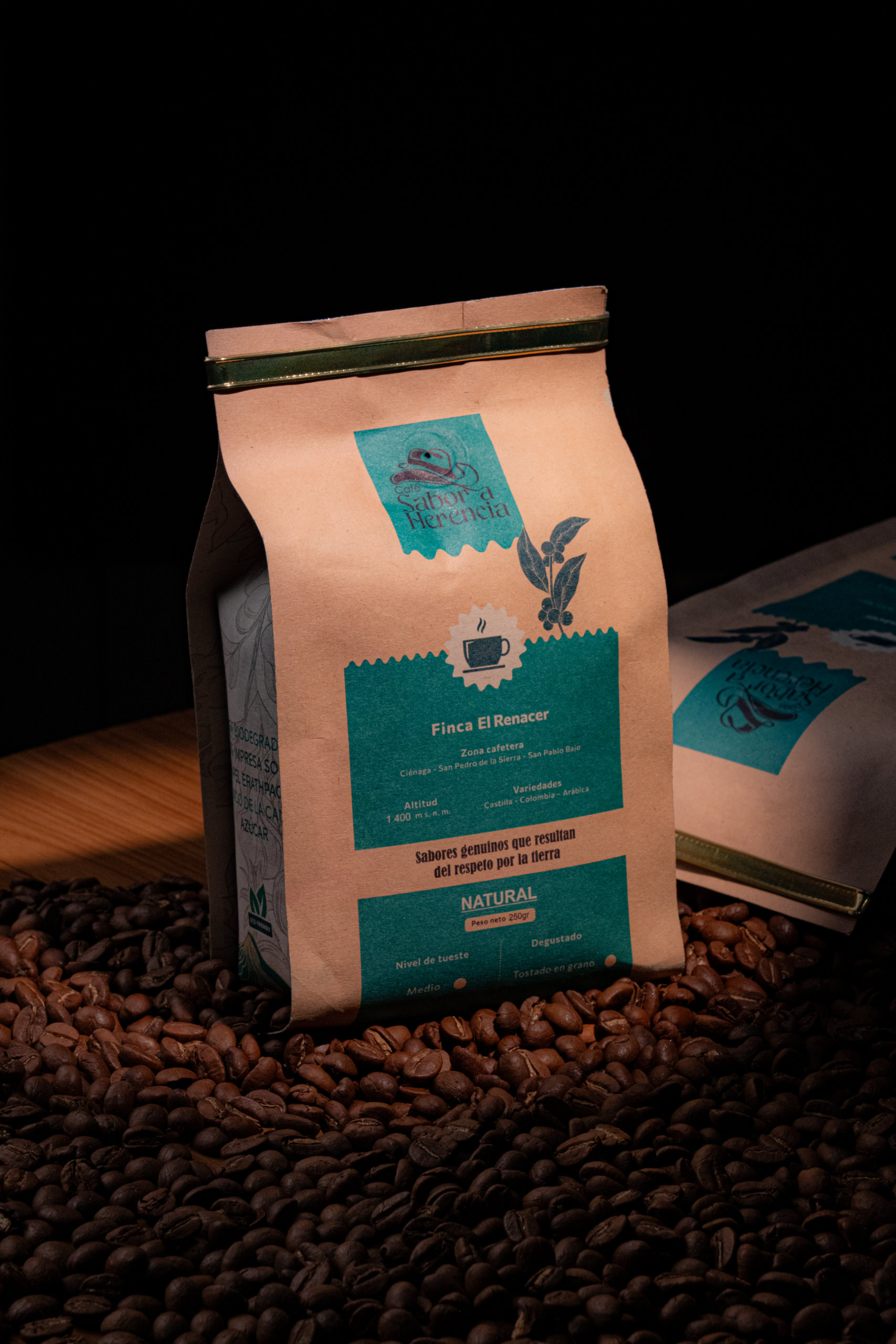 100% Café Arábica Colombiano. Variedad Castillo y Colombia. Cultivado a 1400 m.s.n.m. en la vereda San Pedro de la Sierra, Magdalena. Sin mezclas, sin químicos.
